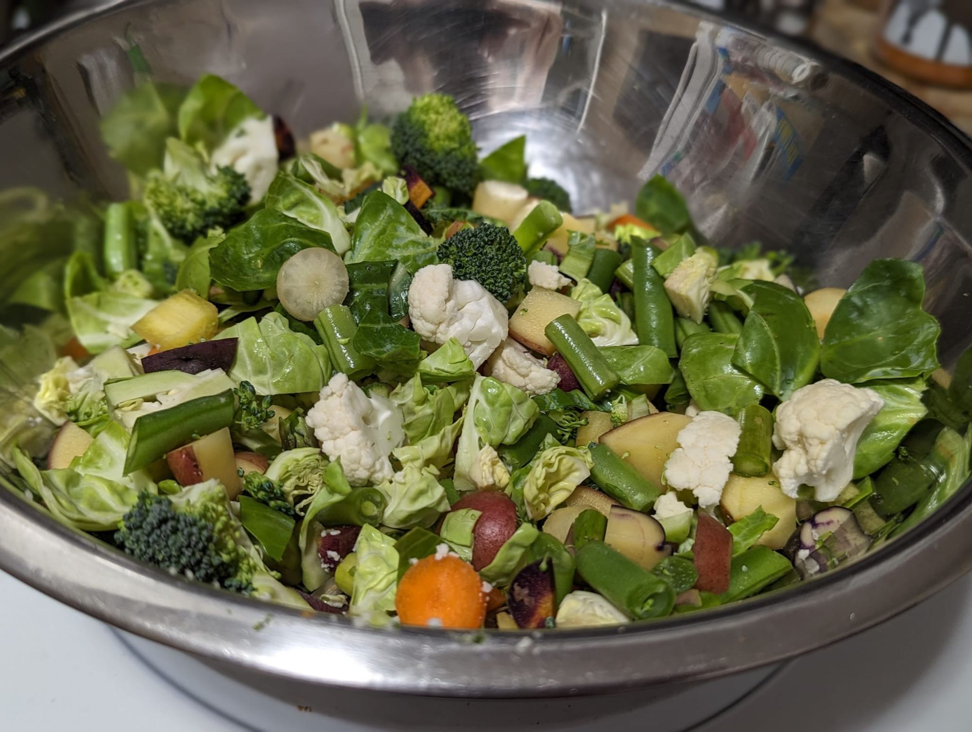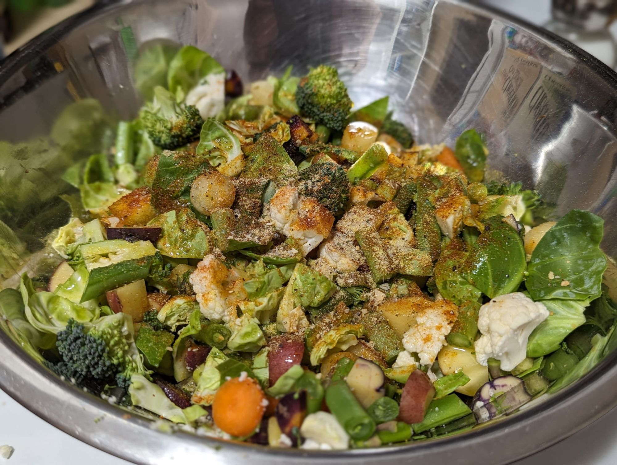 - Hand mix the vegetables thoroughly to ensure even coating of the olive oil and seasonings.